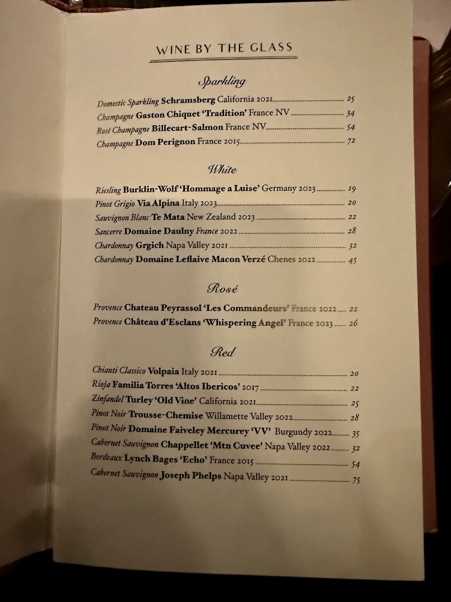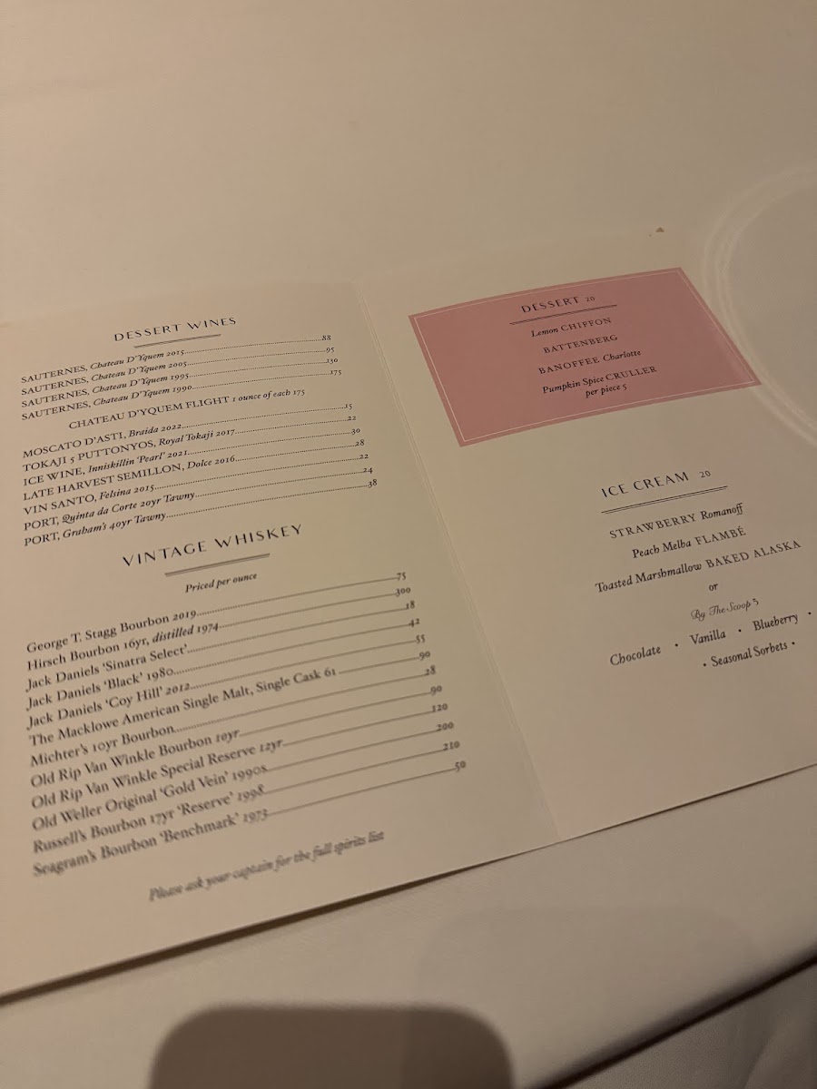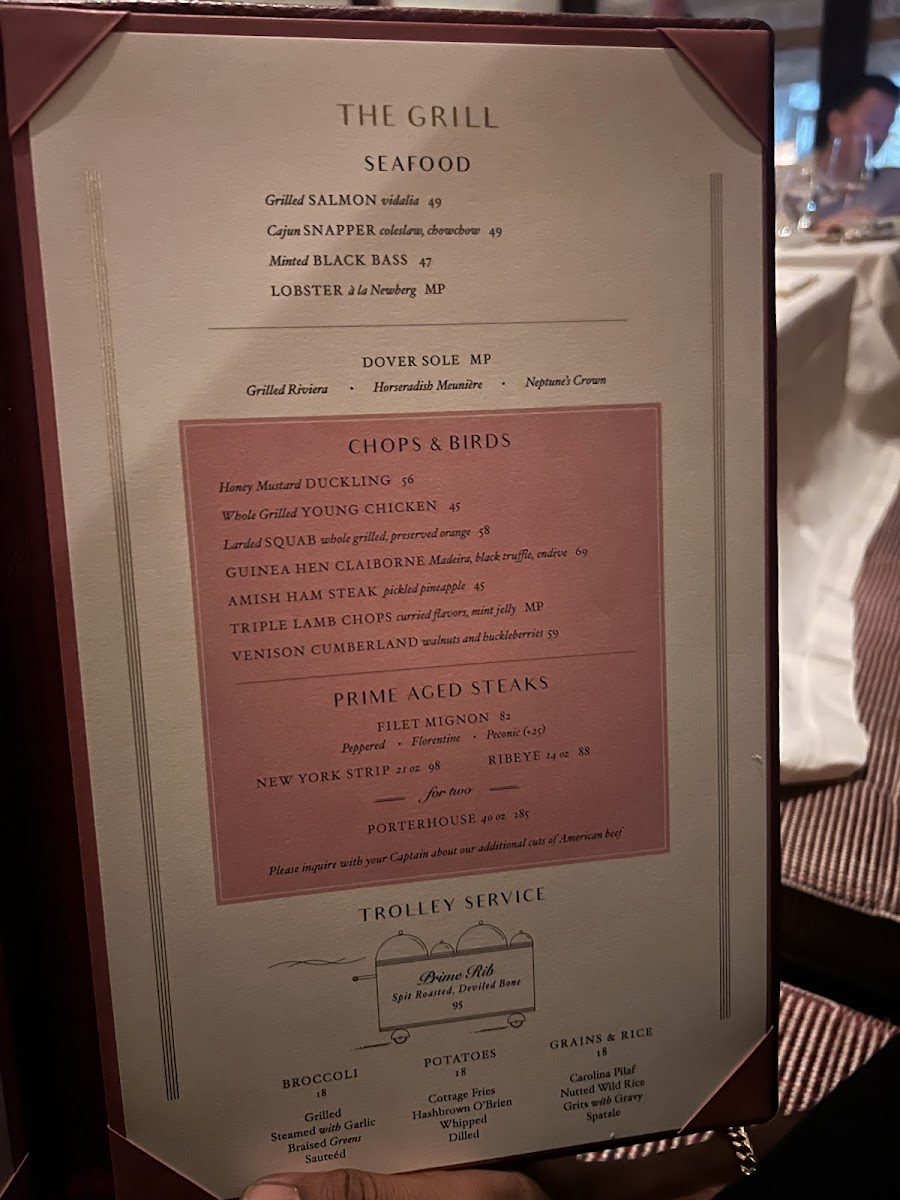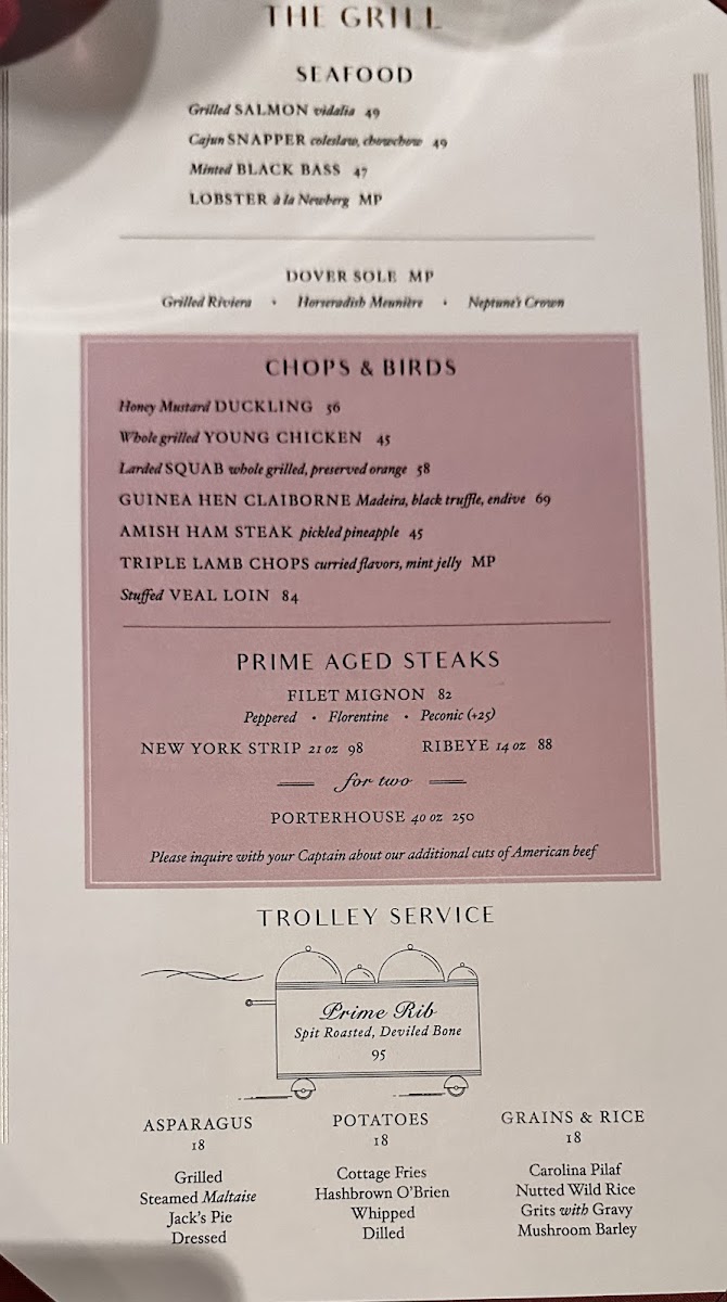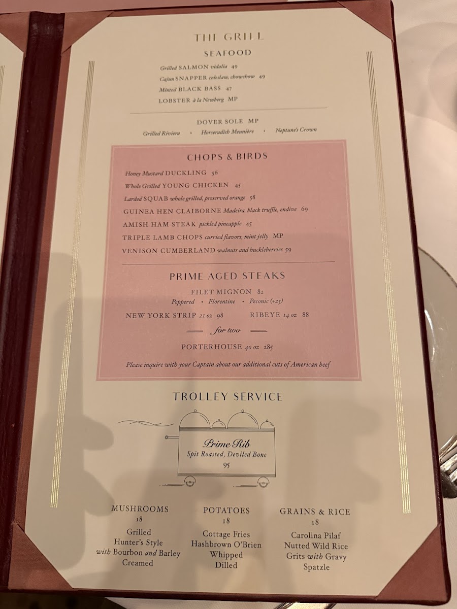 When it comes to the main course, the New York Strip ($98) is a standout, showcasing the quality and marbling that only the finest meats can offer. The Porterhouse and Ribeye are equally irresistible, grilled to perfection and served with your choice of sides, including Cottage Fries or Whipped Potatoes, both at $18. Each side complements the hearty entrees wonderfully, creating a well-rounded meal that feels luxurious without being overdone.