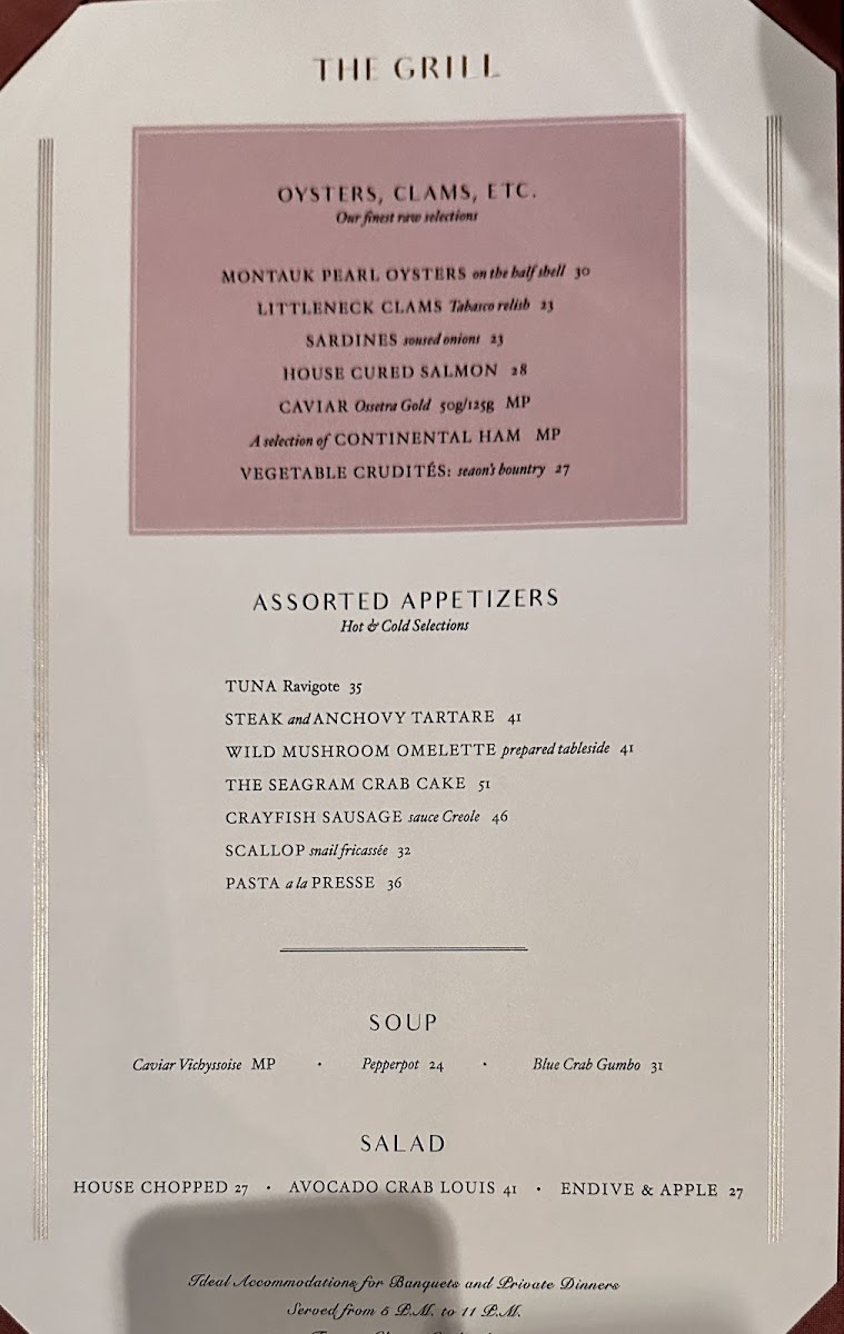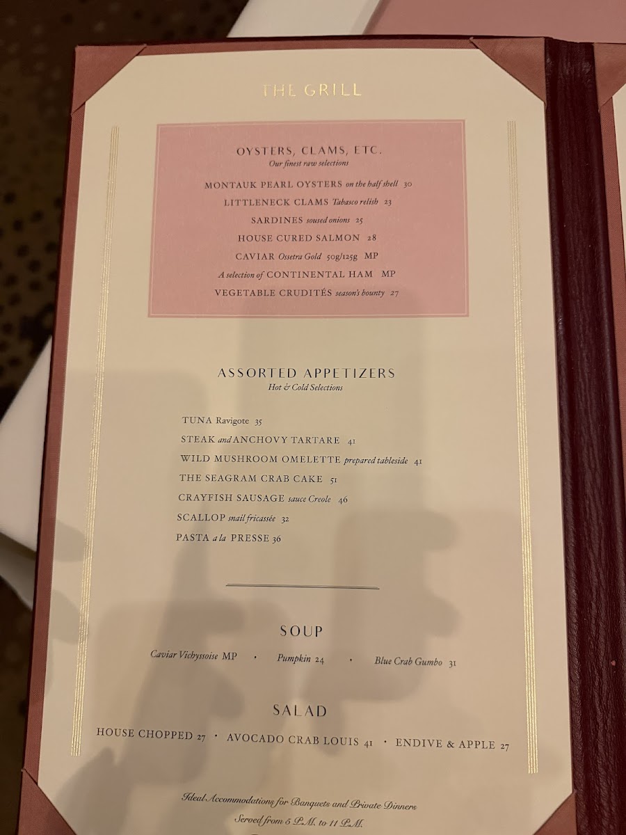 Now, let's talk about the menu. The Grill prides itself on its premium aged steaks and delectable seafood, sure to tantalize your taste buds. Begin your meal with a warm bowl of Corn Chowder ($25) or the rich and flavorful Blue Crab Gumbo ($31)—each bite crafted to create an unforgettable impression. The sumptuous Crab Louie ($41) is a must-try for seafood lovers, while the classic House Chopped Salad ($27) provides a refreshing start to your culinary journey.